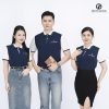 Gam màu trắng tinh khôi điểm xuyết ở phần cổ và dọc hai bên thân sườn áo công ty, tạo sự tương phản hài hòa, giúp tổng thể trang phục trông sáng sủa, trẻ trung và hiện đại hơn. Trắng cũng là màu sắc của sự tinh tế, minh bạch và đổi mới, góp phần nâng cao hình ảnh thương hiệu trong mắt khách hàng.